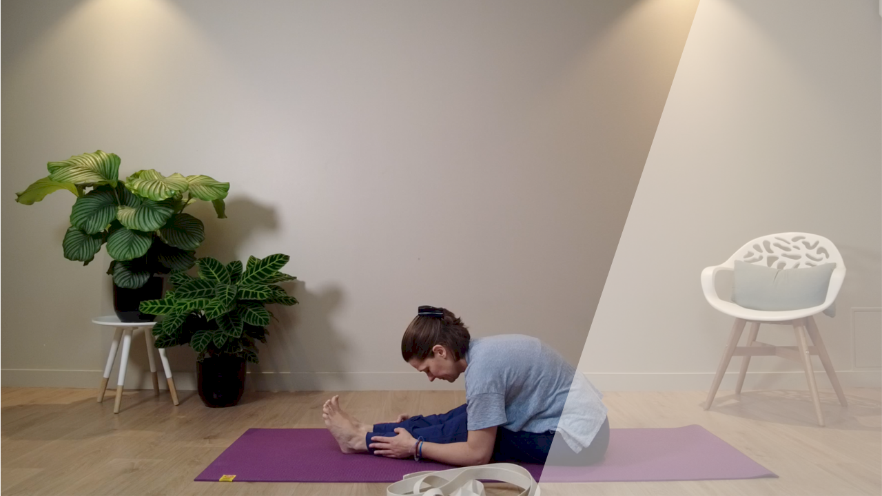 Etirer tout l'arrière du corps par une flexion avant et faire un retour sur soi